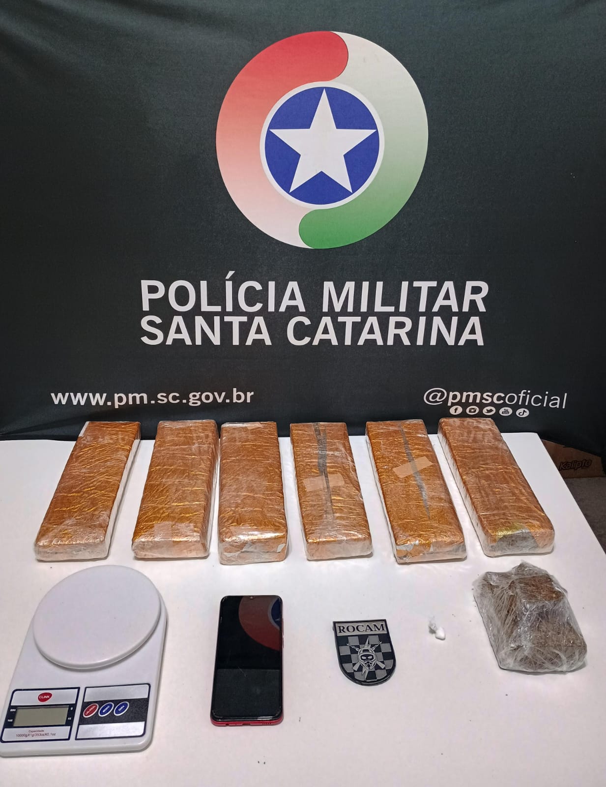 No local, os policiais abordaram o morador, que confirmou a denúncia e entregou voluntariamente uma caixa contendo seis tabletes de maconha, sendo um deles já fracionado, o que totalizou aproximadamente 5 kg. Também foram encontrados uma peteca de cocaína pronta para venda, uma balança de precisão e um aparelho celular.