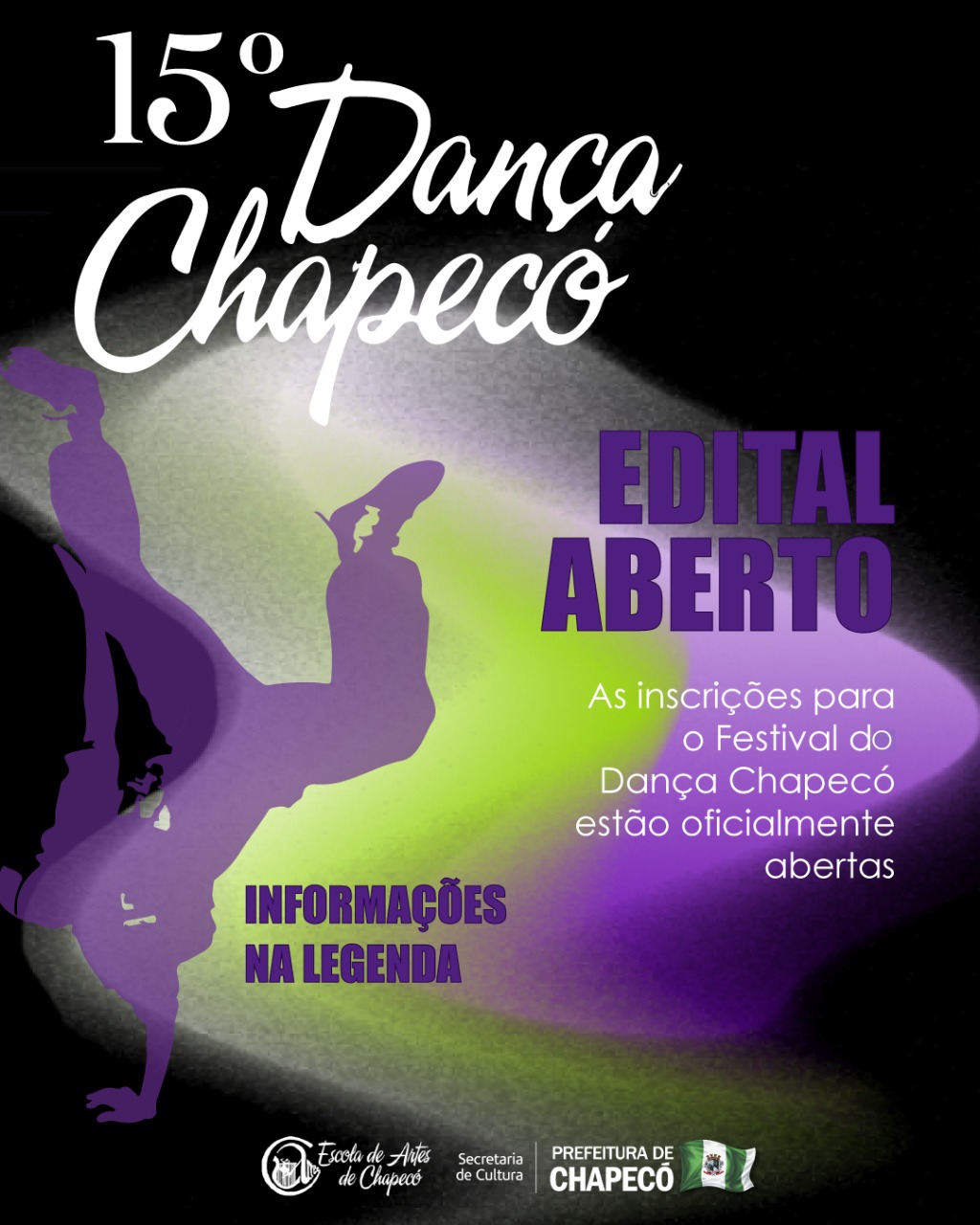 No site da Prefeitura também é possível acessar o edital completo. Só serão aceitas coreografias inéditas. Cada grupo poderá inscrever até 15 coreografias. Serão distribuídas R$ 60 mil em prêmios, divididos em 12 categorias. Outras informações podem ser obtidas pelo e-mail dancachapeco@gmail.com