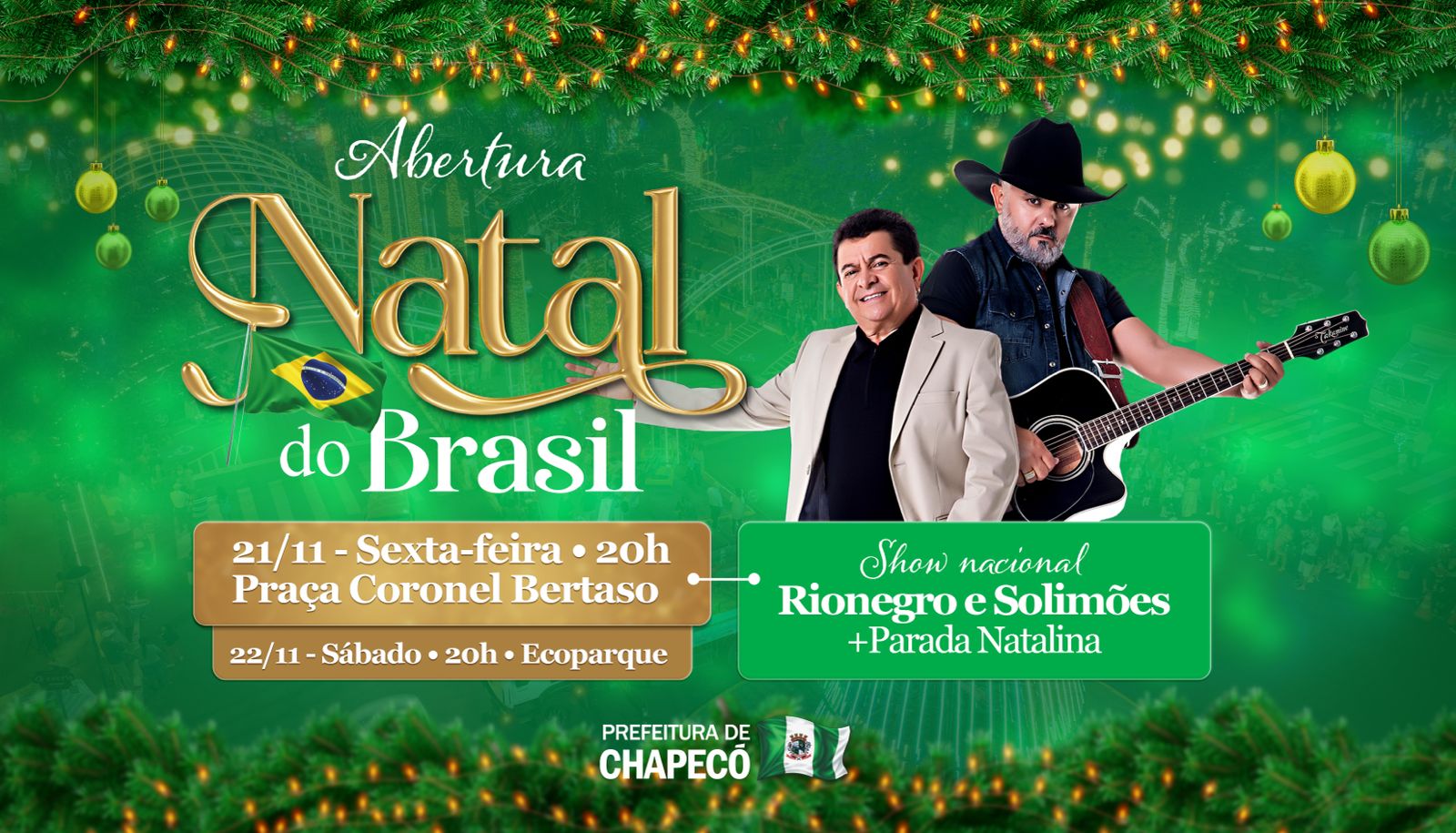 O show com a dupla Rio Negro e Solimões é uma das atrações da abertura da programação do Natal do Brasil, a partir das 20h desta sexta-feira (21), em frente à praça Coronel Bertaso, em Chapecó. Antes do show haverá celebração ecumênica, depois a chegada do Papai Noel e o acendimento das luzes da praça e também da Avenida Getúlio Vargas. Haverá também a reabertura da praça Coronel Bertaso, que ficou fechada temporariamente por alguns dias para a instalação da decoração.
