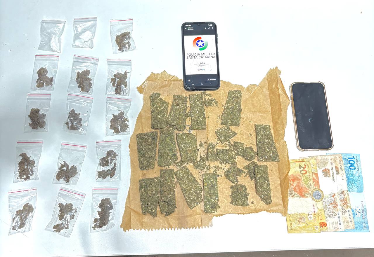 Foram apreendidos 236 gramas de maconha do tipo prensada, fracionada e pronta para a comercialização, 28 gramas de maconha do tipo “purple”, divididas em diversos invólucros, além de 16 gramas de cocaína, também embalada para venda. Ainda foram localizados R$ 241 em dinheiro e um aparelho celular.