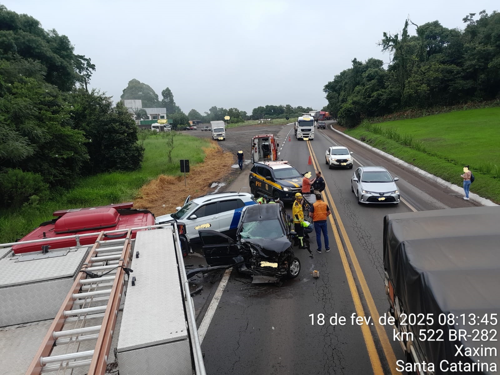 De acordo com boletim emitido pelo 14º Batalhão de Bombeiros Militar de Santa Catarina, unidade de Xaxim, a corporação atendeu na manhã desta terça 18, um grave acidente de trânsito. O registro foi na BR-282, Km 521, próximo ao Acaci Hotel, município de Xaxim. Informações apontam que foi uma colisão frontal entre um GM Corsa e um VW T-Cross.