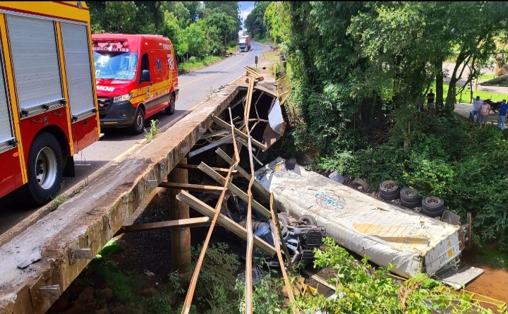 Por volta das 11h30 deste sábado, dia 21 de fevereiro de 2026, as guarnições do 6º Batalhão de Bombeiros Militar foram acionadas para atendimento de ocorrência de acidente de trânsito na SC-157, segunda ponte, sentido Coronel Freitas, envolvendo carreta tracionando contêiner carregado com pés de frango congelados, que após perda de controle saiu da pista e caiu em leito de rio.
