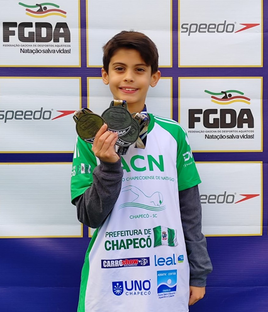 O atleta Guilherme Vieira, da Associação Chapecoense de Natação (ACN), conquistou o título de campeão sulbrasileiro na prova dos 50 metros costas, durante o Campeonato Sulbrasileiro de Natação, realizado de 8 a 10 de maio no Grêmio Náutico União, em Porto Alegre (RS). Com apenas 9 anos, o nadador participou de três provas e obteve três medalhas: uma de ouro e duas de prata. Guilherme iniciou sua trajetória na natação na escolinha da Aquatic Center.