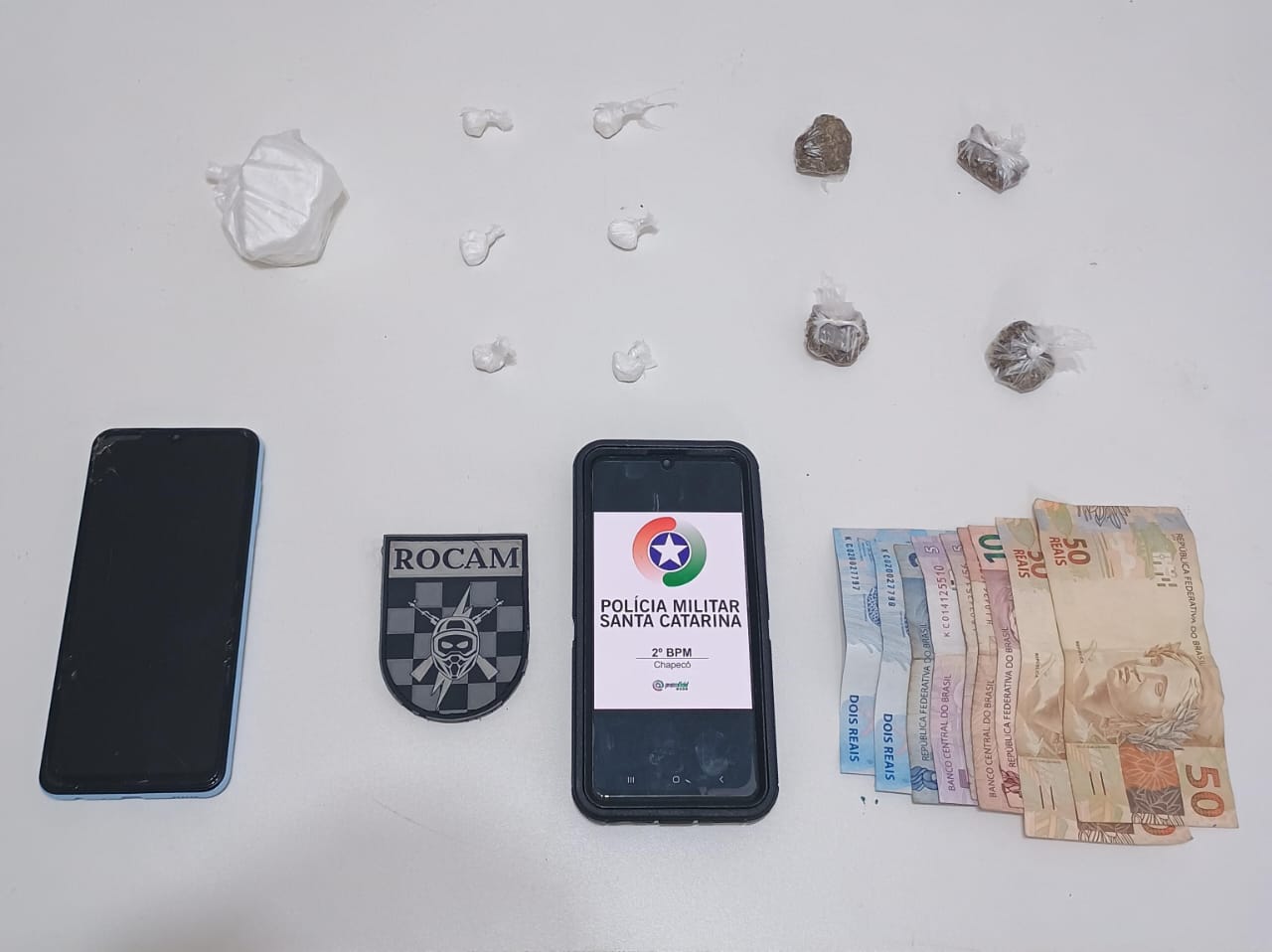 Durante a abordagem, a adolescente indicou que havia mais drogas em sua residência. No local, os militares localizaram uma porção de cocaína pesando cerca de 52 gramas, além de R$ 136 em dinheiro e um telefone celular.