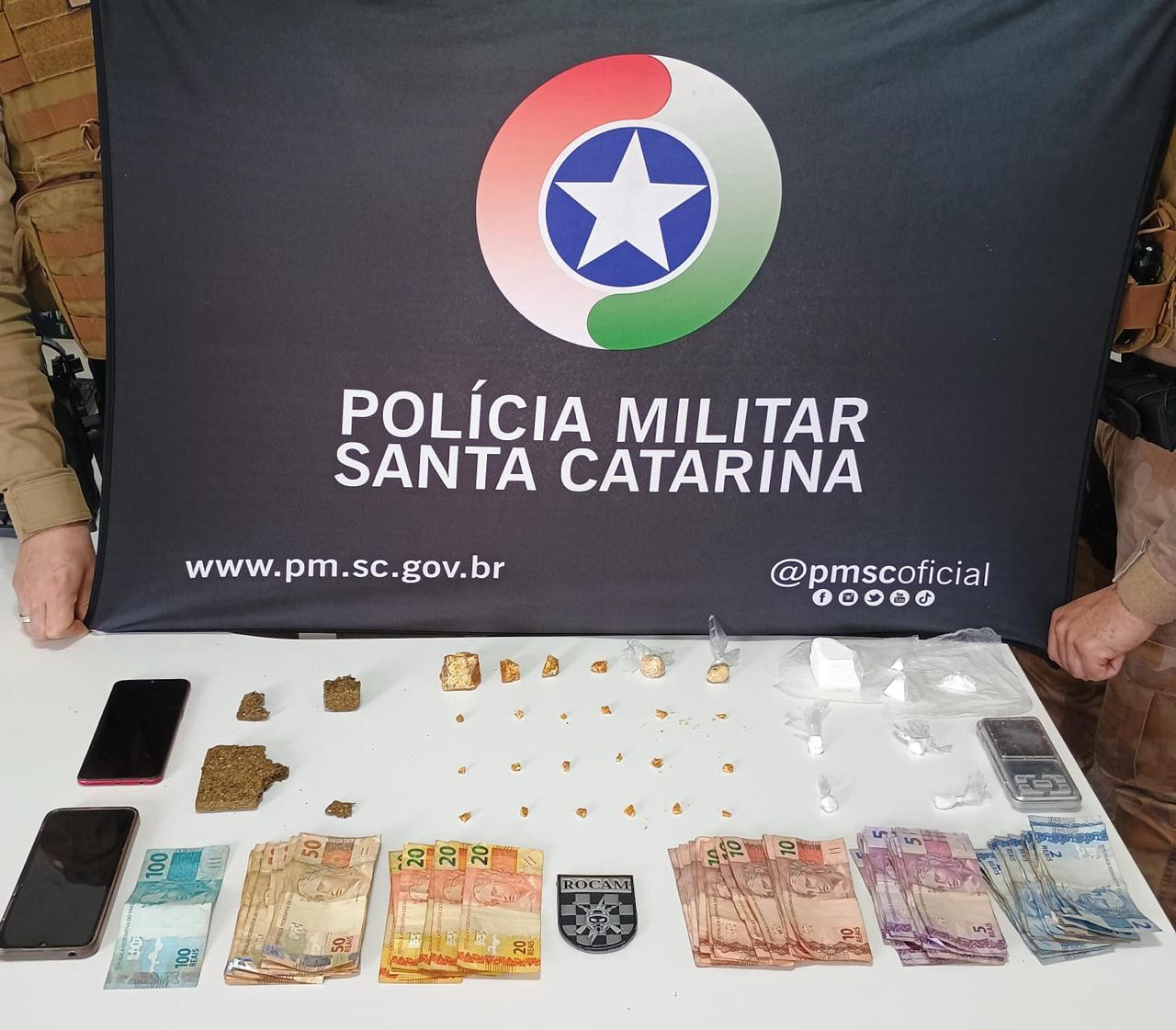 Com ela, a PM encontrou crack, cocaína, maconha, dinheiro, celulares e uma balança de precisão