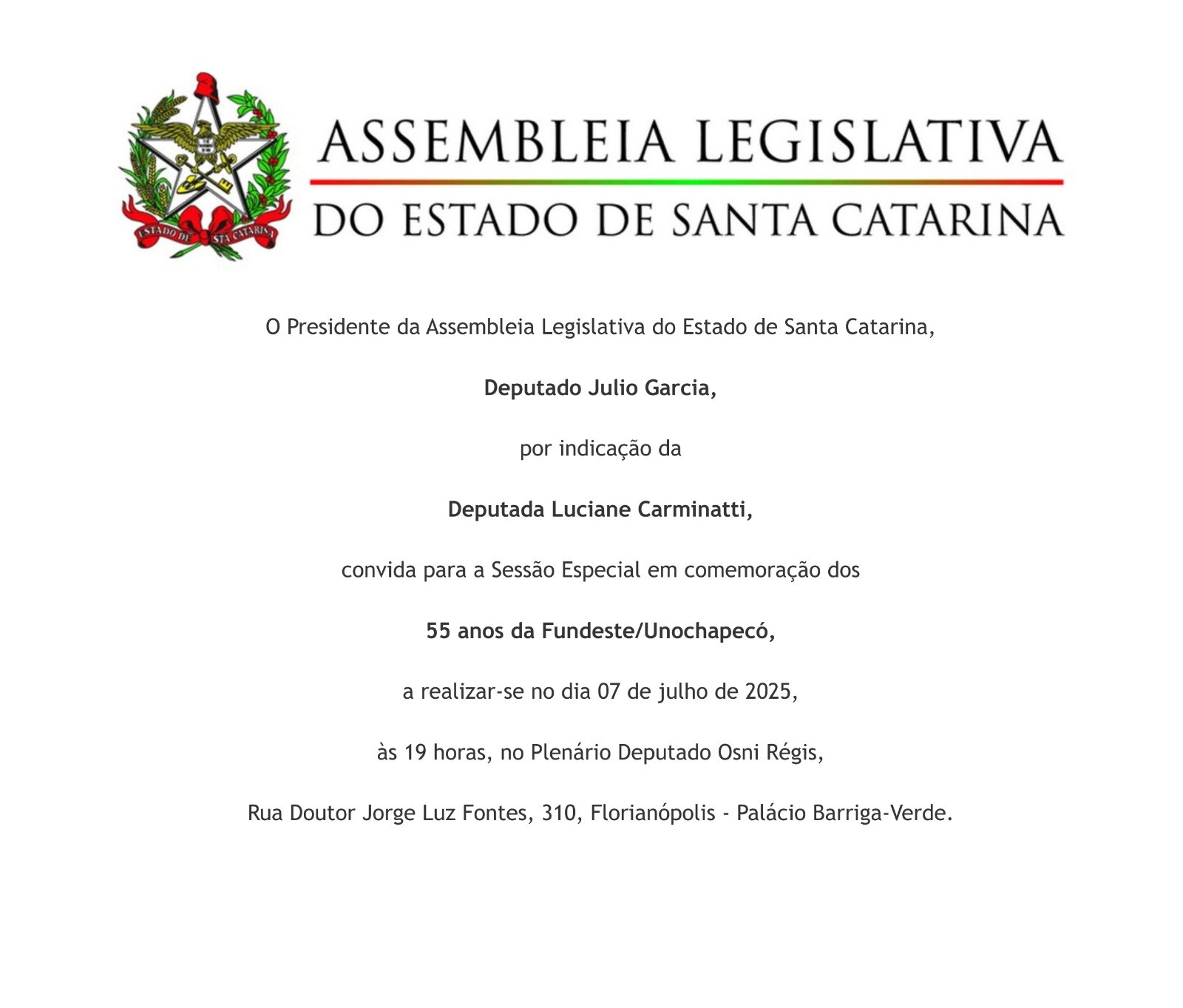 A Assembleia Legislativa do Estado de Santa Catarina (Alesc) realiza nesta segunda-feira, 7, uma Sessão Especial em homenagem aos 55 anos da Fundação Universitária do Desenvolvimento do Oeste (Fundeste) e da Universidade Comunitária da Região de Chapecó (Unochapecó).