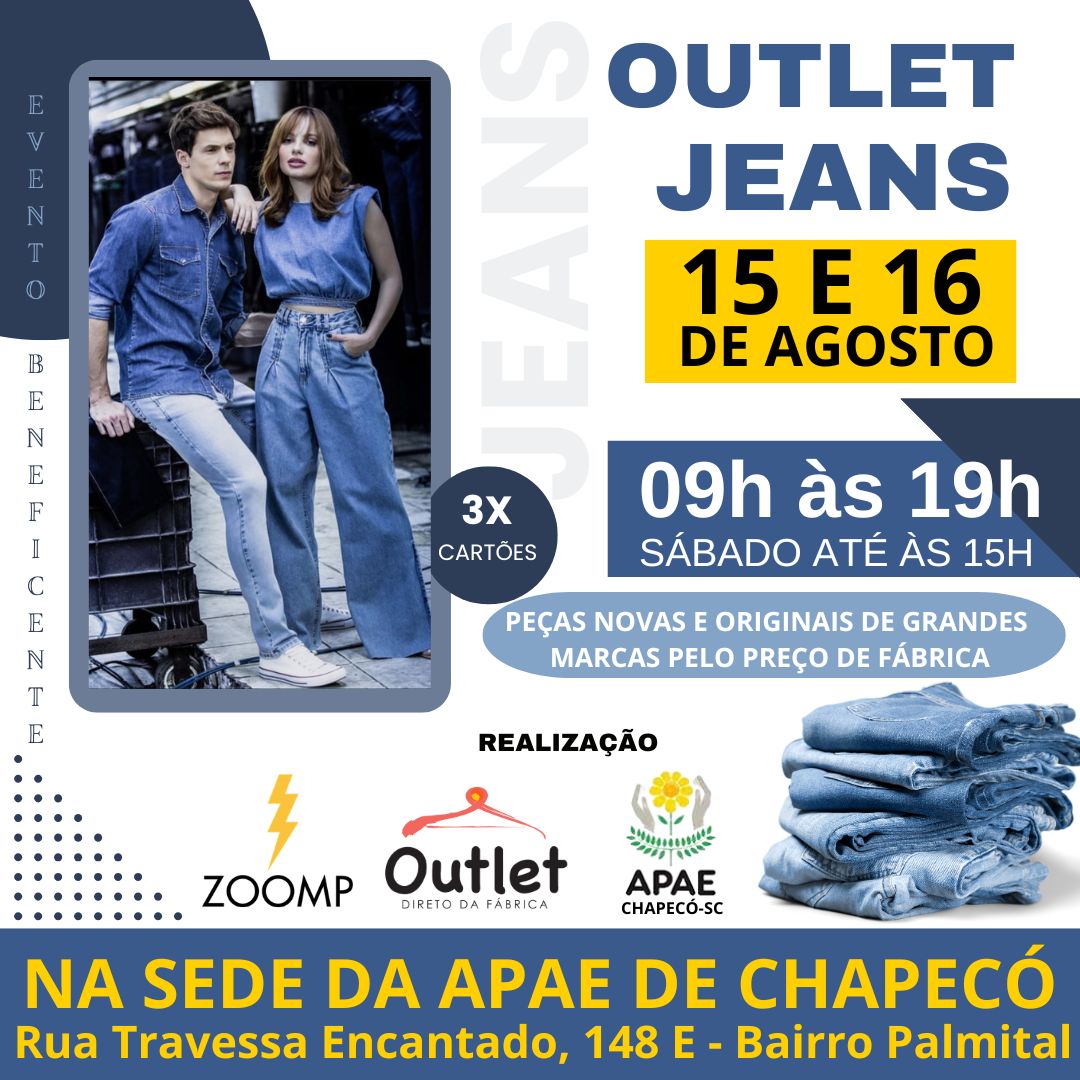 A Associação de Pais e Amigos dos Excepcionais de Chapecó (Apae) estará promovendo o Outlet Jeans beneficente, na próxima sexta-feira e no sábado, dias 15 e 16 de agosto. Serão comercializadas mais 1.500 peças de roupas jeans, femininas e masculinas, com até 70% de desconto.