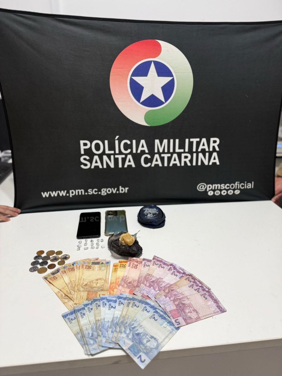 A mulher que estava na garupa foi abordada e passou por revista feita por uma policial feminina. Dentro de uma pochete escondida entre seus seios, foram encontrados R$ 605,05 em notas variadas e 14 pedras de crack já fracionadas para venda.