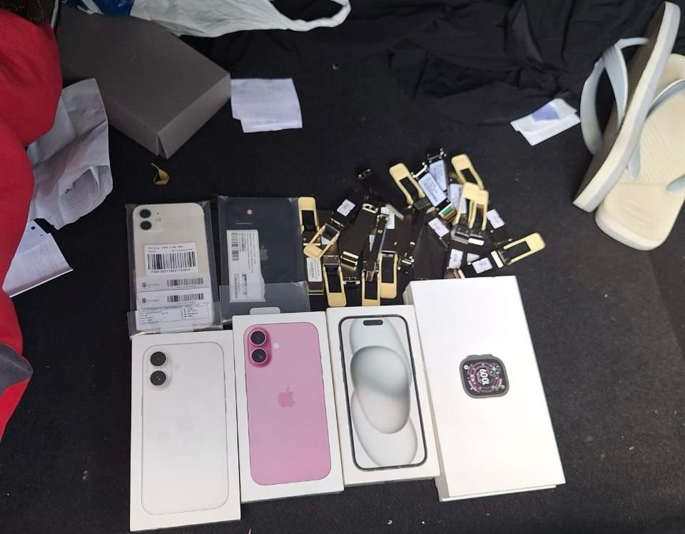 Conforme a guarnição, o veículo Ford/Ka emplacado em Pinhalzinho era conduzido por um suspeito que relatou ter ido a Foz do Iguaçu, onde teria adquirido produtos no Paraguai. Durante a vistoria, os policiais encontraram cinco aparelhos celulares modelo iPhone, um relógio smartwatch e cerca de vinte memórias portáteis escondidas no veículo.