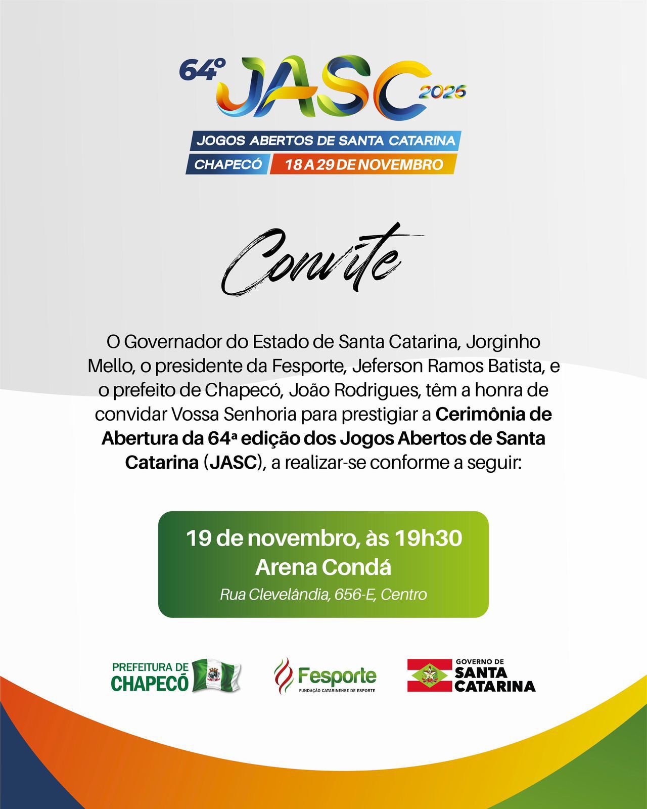 Chapecó será o centro das atenções esportivas de Santa Catarina. A cidade sediará a cerimônia de abertura da 64ª edição dos Jogos Abertos de Santa Catarina (JASC), marcada para o dia 19 de novembro, às 19h30, na Arena Condá.