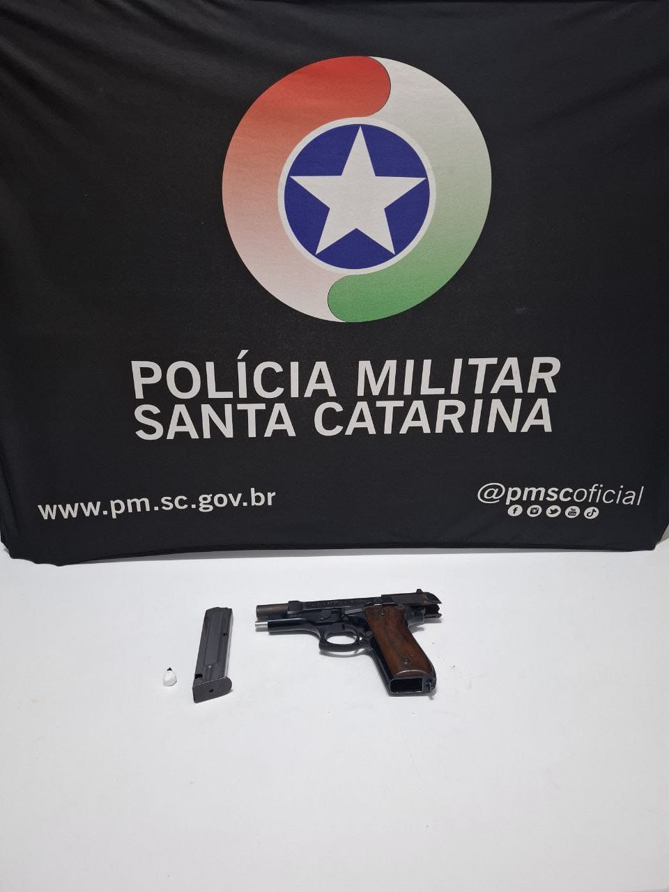 Em seguida, durante a busca no interior do automóvel, os policiais encontraram uma pistola calibre 7,65 mm escondida sob o banco do caroneiro. Diante da situação, foi dada voz de prisão ao suspeito, que foi informado de seus direitos e algemado por receio de fuga.
