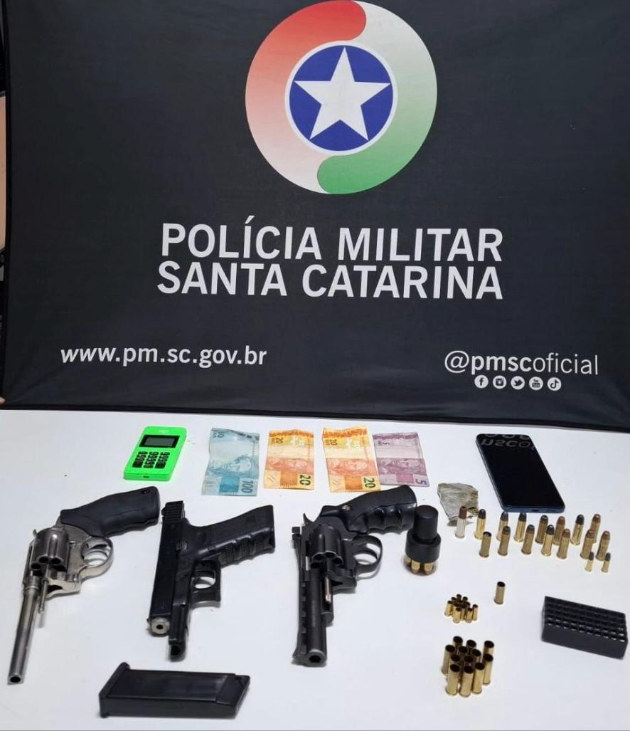 Uma ação da Polícia Militar resultou na apreensão de armas, munições, simulacros e pequenas porções de droga na noite deste sábado, na Av. Getúlio Vargas, esquina com a rua Araguaia, no bairro Universitário, em Chapecó.
