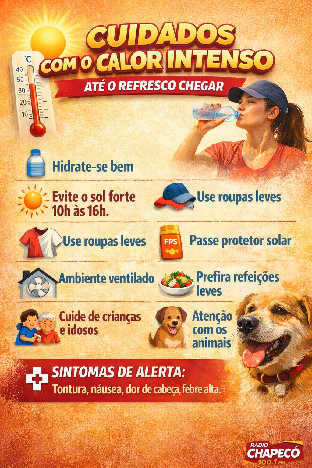 Enquanto a primeira massa de ar frio de 2026 não chega, calor intenso exige atenção redobrada com a saúde; arte: Da Redação Rádio Chapecó 100.1 FM