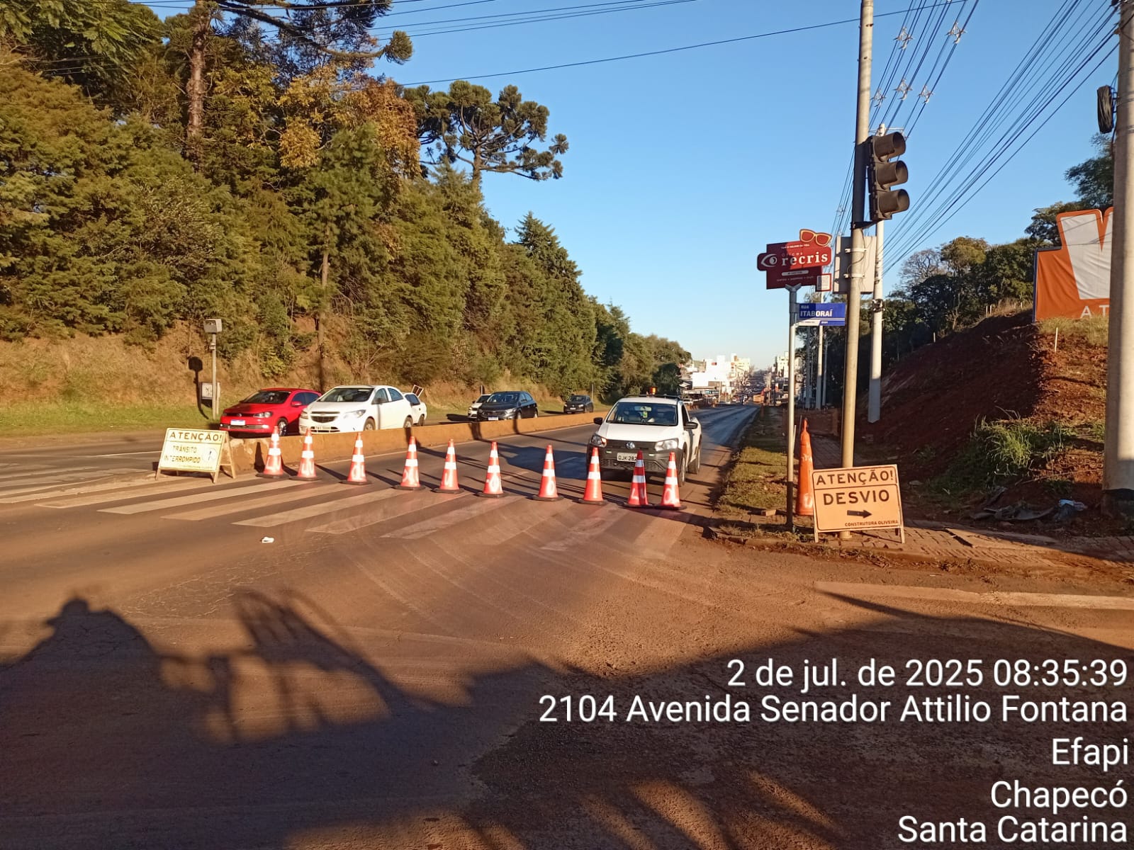 O fechamento ocorre das 7h30 às 17h30. O trânsito está sendo desviado pela rua Itaboraí, passando pela Unochapecó e descendo a Servidão Anjos da Guarda. No sentido Bairro/Centro o fluxo está liberado pela Attilio Fontana.