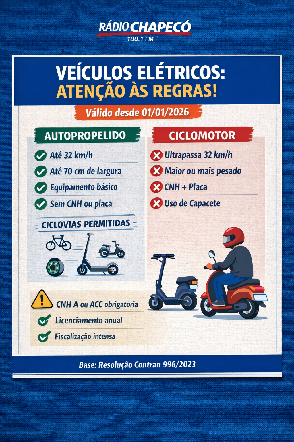 Os ciclomotores — veículos de duas ou três rodas, com motor de até 50 cilindradas ou elétrico de até 4 kW e velocidade máxima de 50 km/h — deverão ter emplacamento, licenciamento e condutor habilitado (CNH A ou ACC). O uso de capacete será obrigatório para condutor e passageiro.