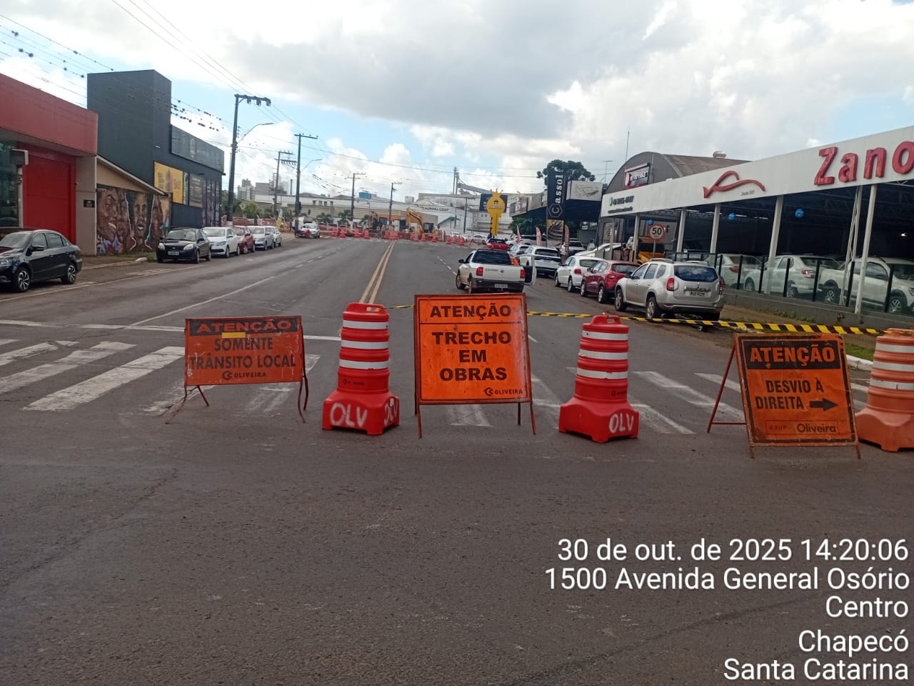 A Prefeitura de Chapecó informa que a Avenida General Osório foi fechada nesta quinta-feira (30), entre a avenida São Pedro e a rua Paulo Marques. Quem vem no sentido Sul/Norte pode acessar as avenidas Porto Alegre e Fernando Machado como alternativa. Quem vem no sentido Norte/Sul pode desviar pela rua Paulo Marques e pegar a avenida Porto Alegre