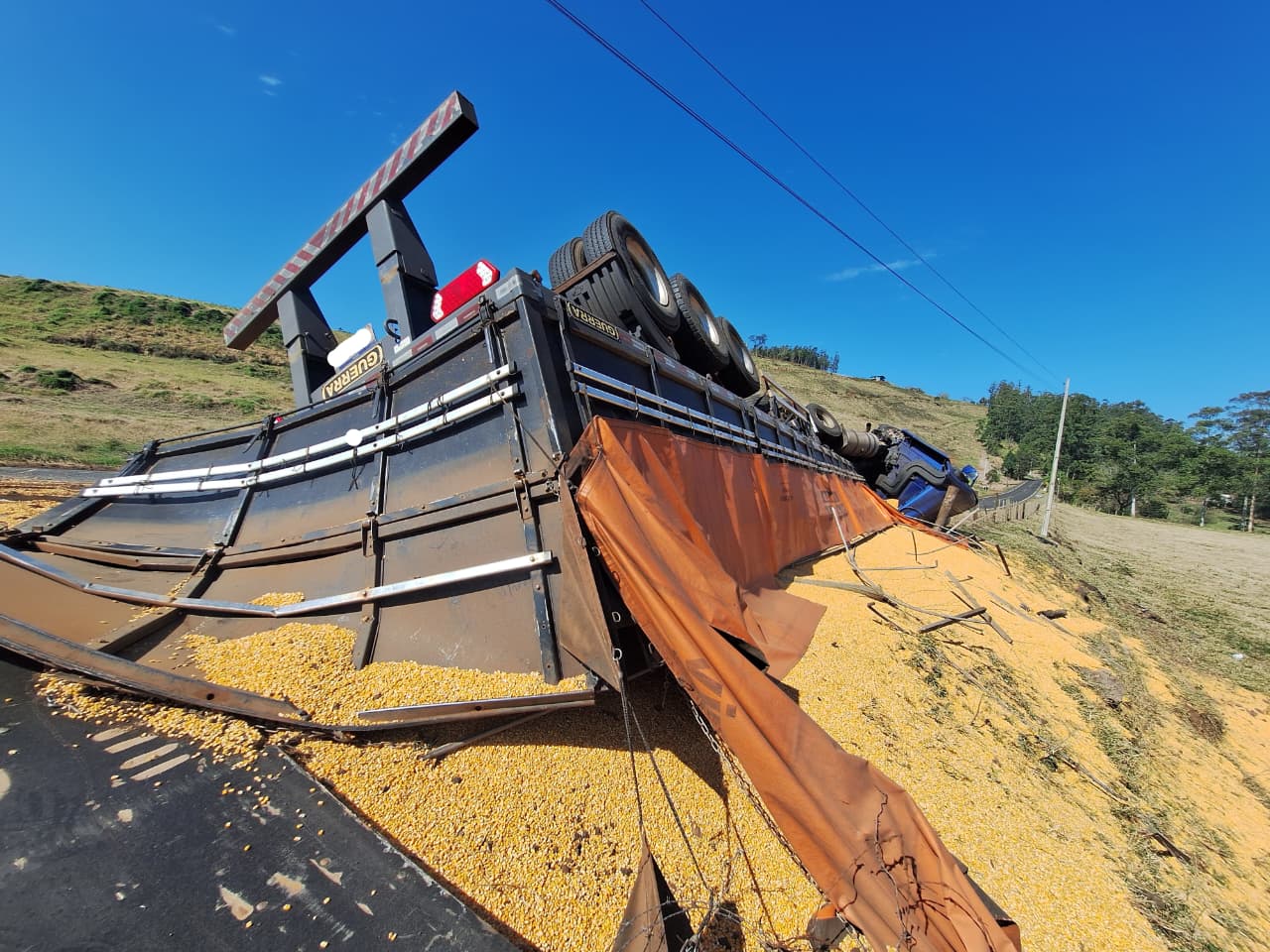 Motorista sofre apenas ferimentos leves; carga de milho ficou espalhada pelo local