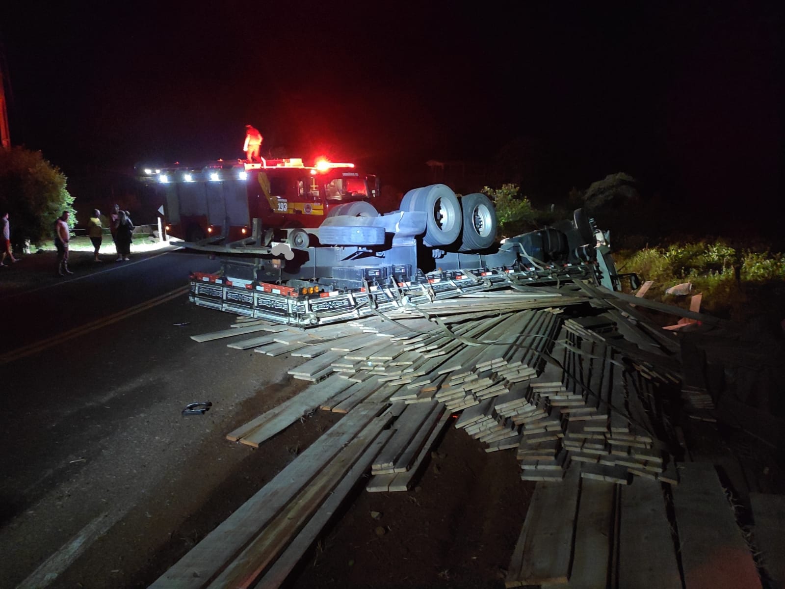 De acordo com o Corpo de Bombeiros Militar, a ocorrência envolveu um caminhão Ford Cargo, que transportava carga de madeira e acabou capotando às margens da via. No local, as equipes realizaram o gerenciamento de riscos, com verificação de possíveis vazamentos e desligamento da bateria do veículo.