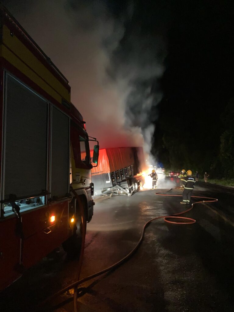 Ao chegarem ao local, os bombeiros constataram que o incêndio se concentrava nos rodados da carreta, que já havia sido desprendida do cavalo mecânico pelo condutor. Segundo o motorista, o fogo começou após um dos pneus do veículo estourar.