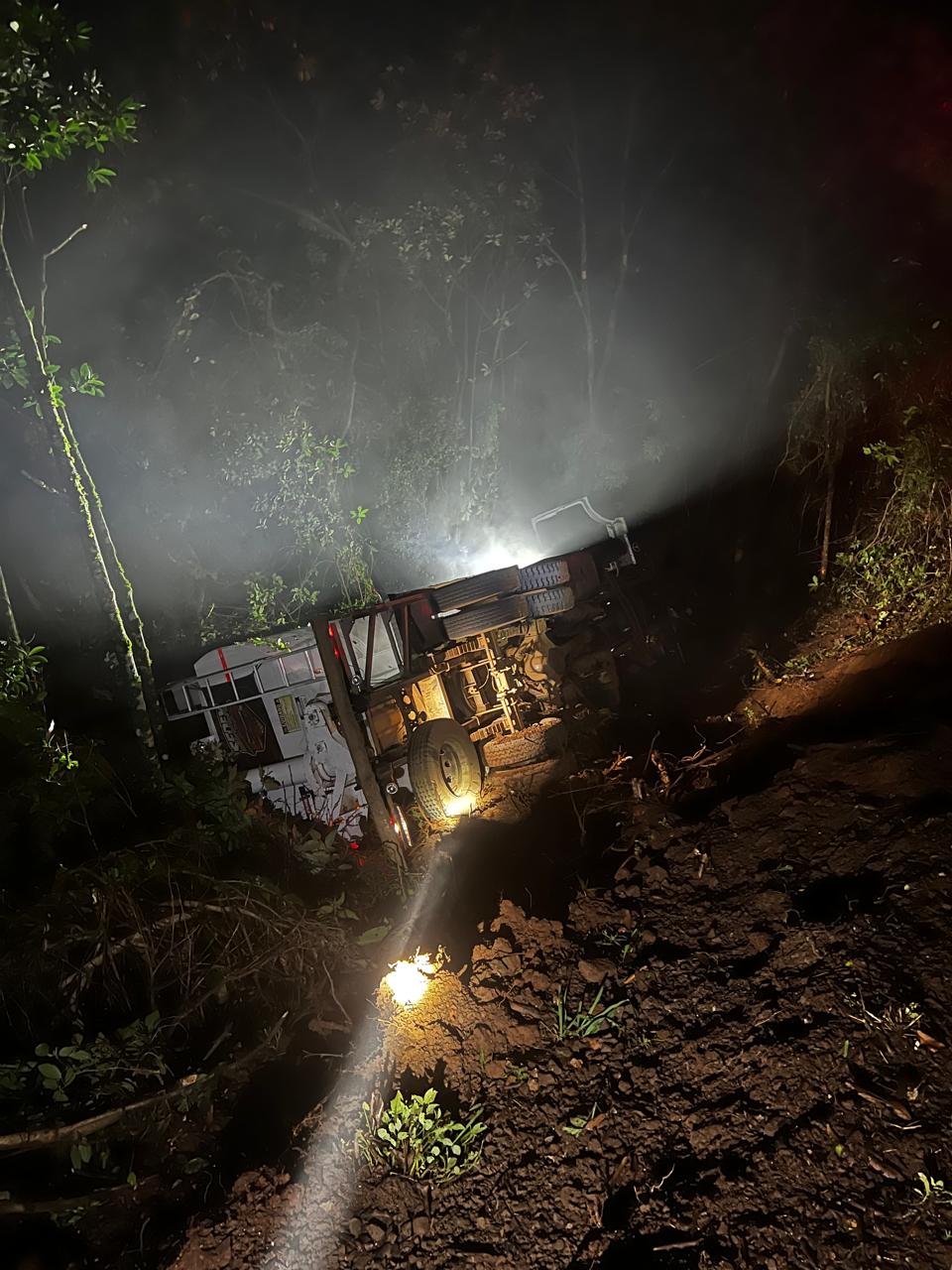 O atendimento foi realizado pela equipe de socorristas do Corpo de Bombeiros Militar. No local, os socorristas encontraram um caminhão carregado com ração que havia saído da pista e capotado, ficando lateralizado em uma ribanceira de aproximadamente 10 metros.