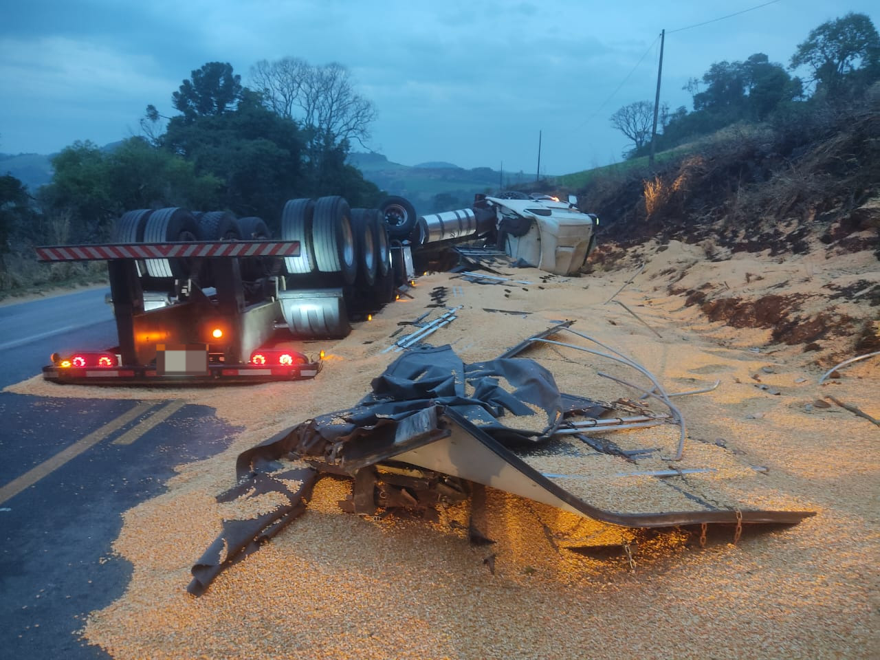 Um caminhão Scania/G 380, carregado com sementes de milho, tombou por volta das 6h00min desta quinta-feira (24). O acidente foi registrado em Alto da Serra, interior do município de Ouro Verde, no Oeste catarinense.