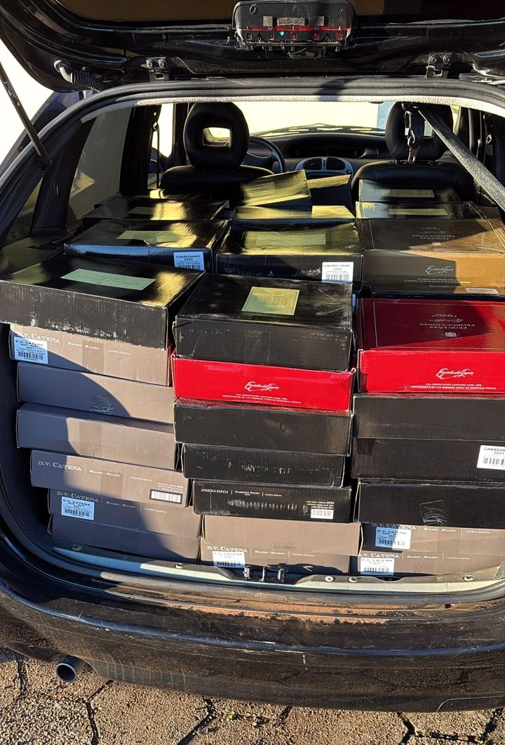 Um Citroen/Picasso de Marmeleiro/PR foi parado pelos policiais durante fiscalização de rotina. A equipe encontrou as garrafas escondidas no porta-malas e no interior do veículo, ocultas por um tecido preto. O condutor, paranaense de 30 anos, admitiu que foi contratado para transportar as caixas de vinho da fronteira com o Paraguai até a região de Chapecó, mas não sabia quem enviou a carga ou quem a receberia.