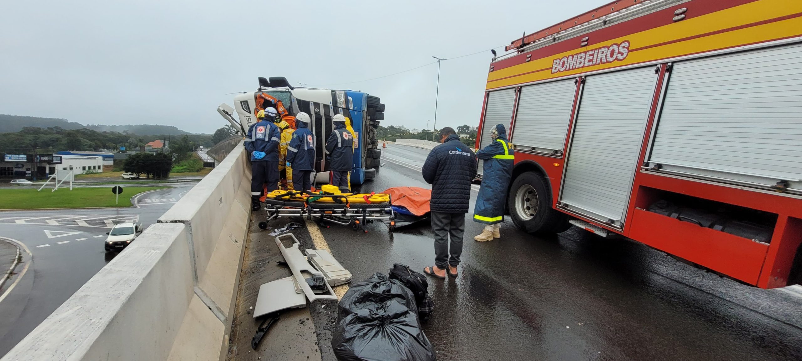 Na manhã desta quarta-feira (28), um acidente de trânsito mobilizou equipes de resgate no trevo de acesso a Chapecó, na BR-282. Uma carreta carregada com produtos refrigerados tombou na pista, exigindo a atuação do Corpo de Bombeiros Militar para o atendimento à ocorrência.