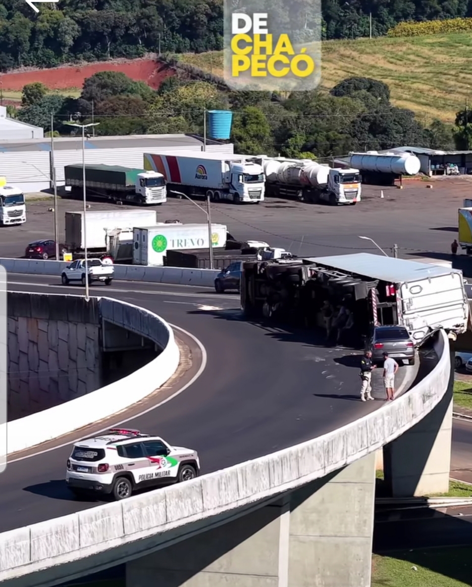 Uma carreta tombada no elevado da BR-282, em Chapecó, mobilizou equipes de atendimento nas últimas horas e chamou a atenção de quem passava pelo local. A equipe de reportagem da Rádio Chapecó esteve presente e acompanhou a ocorrência de perto. As imagens registradas mostram a carreta tombada sobre a pista, além da movimentação de equipes atuando no atendimento e na organização do trânsito.