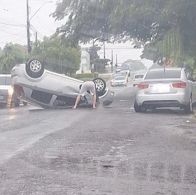 Segundo os bombeiros dos quartéis Centro e Efapi, o condutor de um Fiat Punto perdeu o controle após colidir contra um Kia Cerato que estava estacionado. Com o impacto, o Punto acabou capotando sobre a via.
