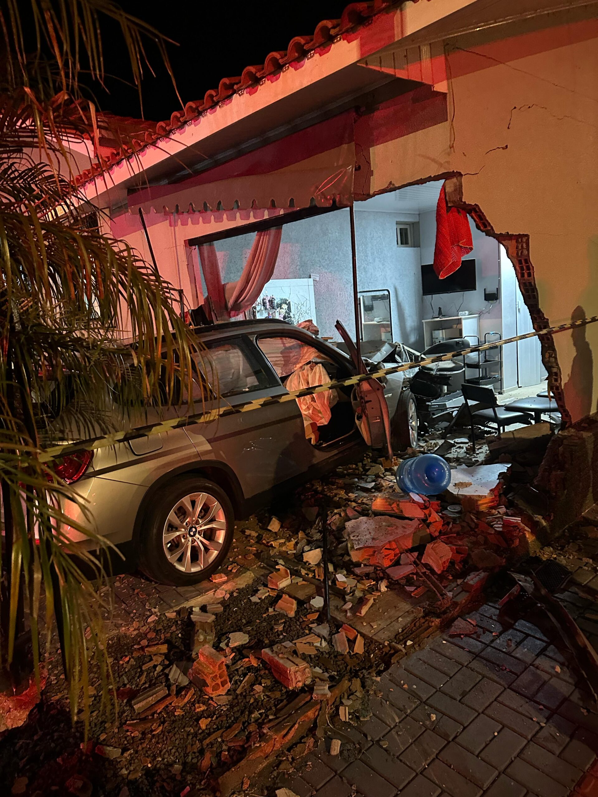 Com o impacto, foi danificado o muro e paredes do estabelecimento, além da parte frontal e lateral do veículo.