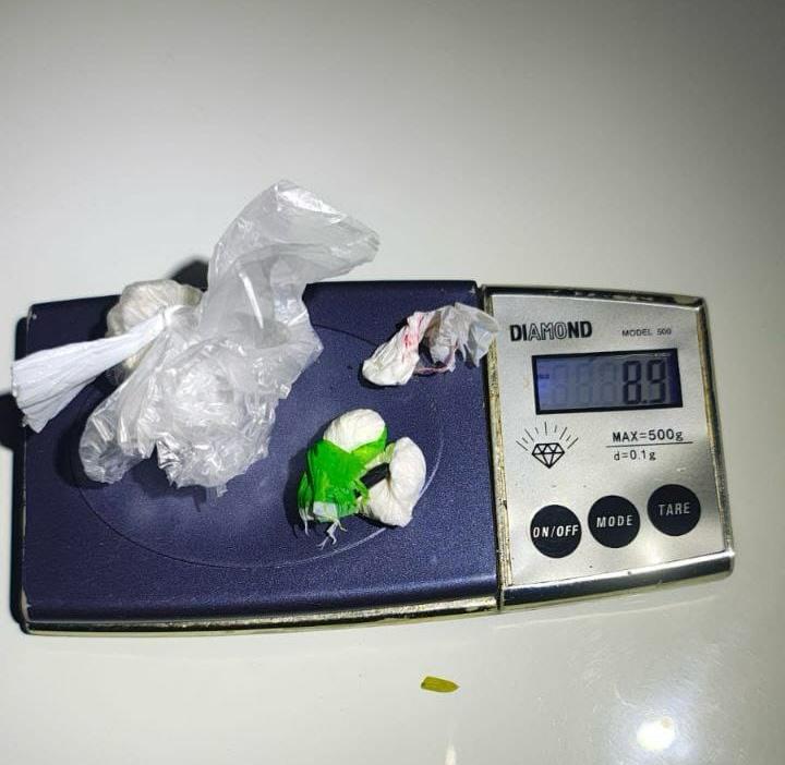 Em buscas no interior da casa, foram encontrados 8,9 gramas de cocaína, além de duas balanças de precisão, comumente utilizadas no fracionamento de entorpecentes para comercialização. Já na garagem, os policiais localizaram uma motocicleta Honda 125, que, após consulta pelo número do motor, foi identificada como furtada/roubada no estado de São Paulo, caracterizando o crime de receptação.