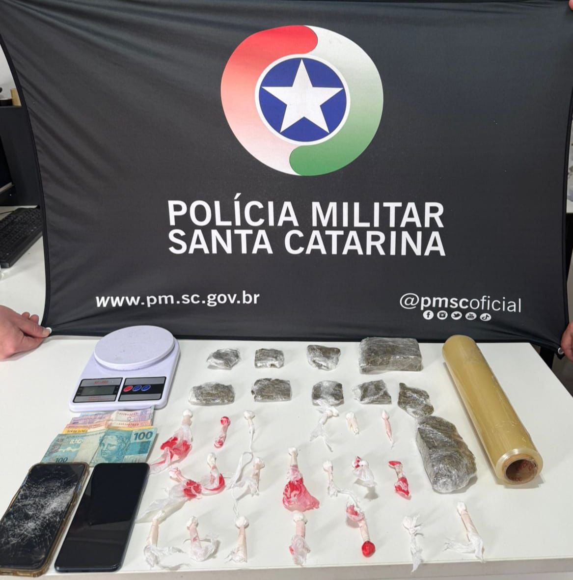 Também foram apreendidos uma balança de precisão, um rolo de plástico filme utilizado para embalar drogas e R$ 139,00 em dinheiro, encontrados no bolso do suspeito. Durante a abordagem, o homem ficou alterado, gritou e chegou a quebrar o próprio celular, sendo necessário o uso de algemas para contê-lo.