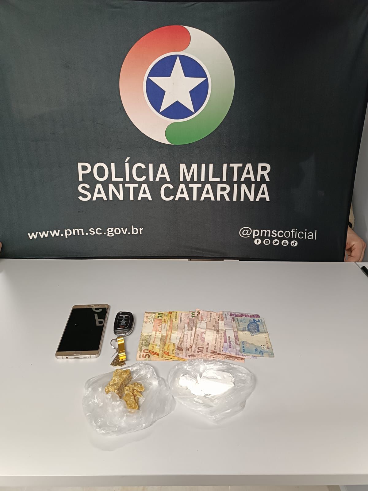 Em buscas no local, a guarnição localizou aproximadamente 100 gramas de entorpecentes, sendo cerca de 49,7 gramas de substância análoga à cocaína e 49,1 gramas de substância análoga ao crack, que estavam escondidas em um pacote de salgadinho.