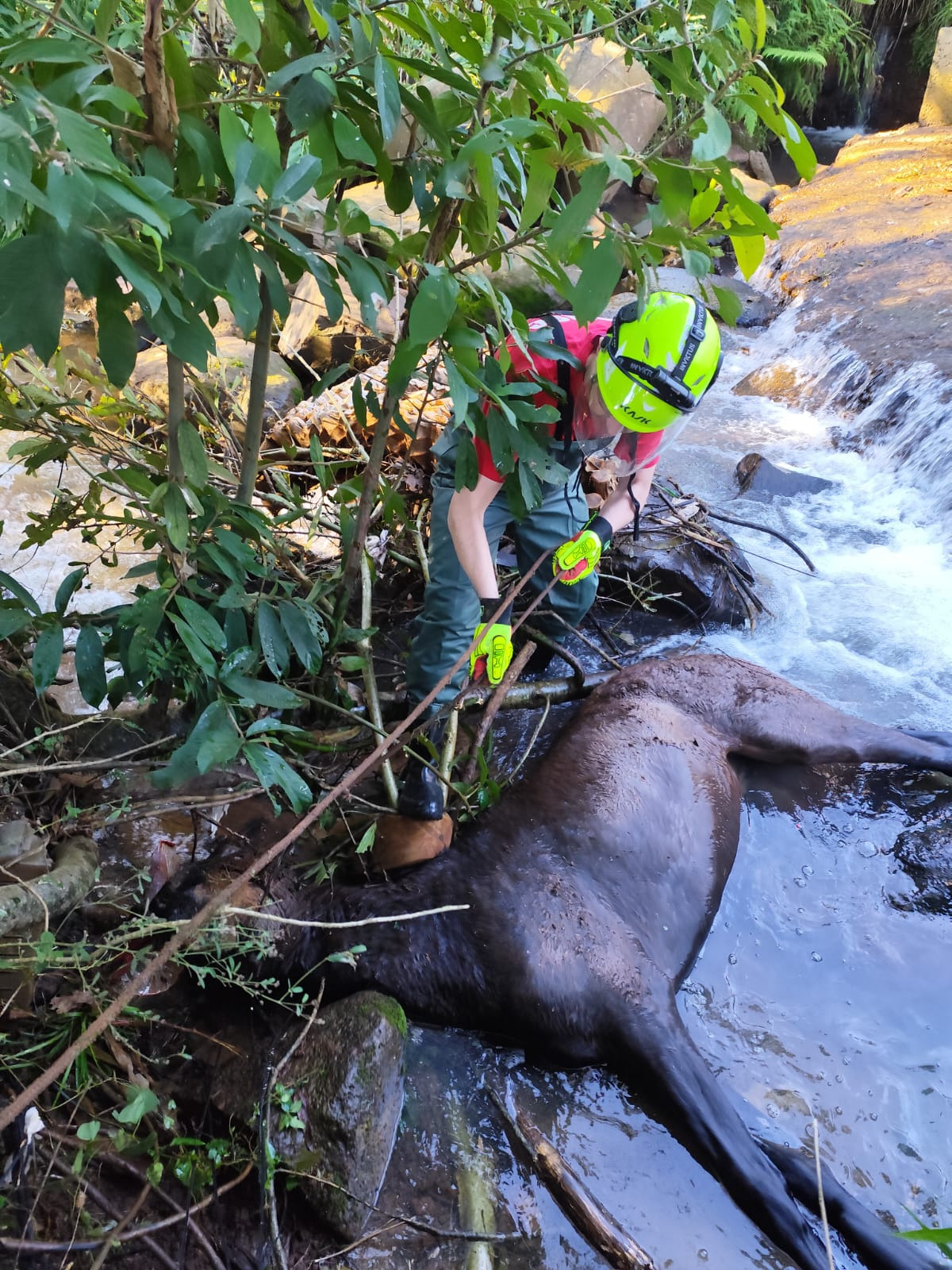 Com o uso do maquinário, o resgate foi concluído com êxito e o animal foi retirado do riacho ainda com vida. Como o proprietário não foi localizado, o cavalo foi deixado em uma área seca e segura, sob sol, para se recuperar. A operação durou cerca de duas horas.