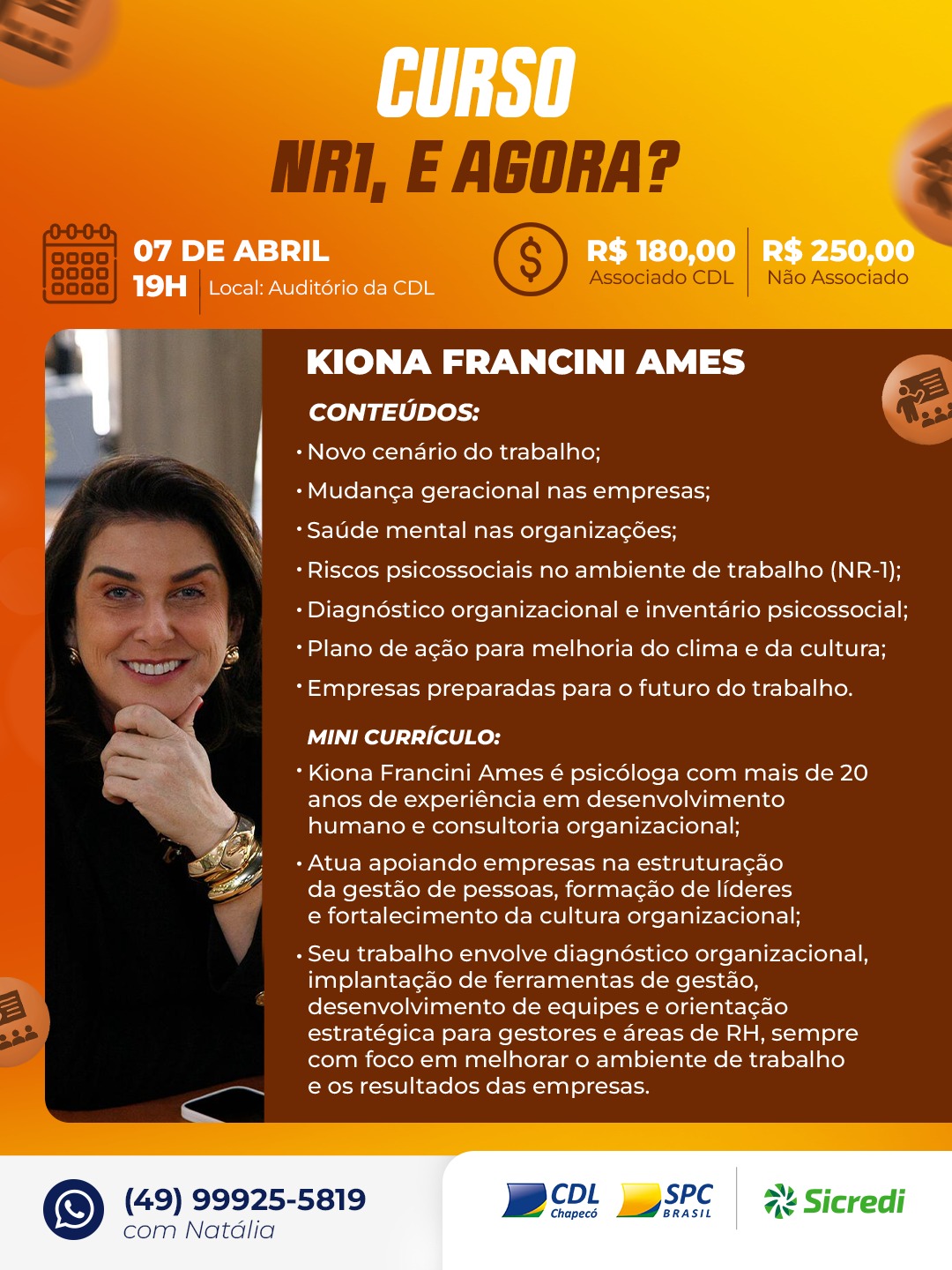 As vagas são limitadas e as inscrições já estão abertas. O investimento é de R$ 180,00 para associados da CDL e R$ 250,00 para não associados. As inscrições podem ser feitas pelo telefone/WhatsApp (49) 99925-5819, com a agente comercial da CDL, Natália Mônego.
