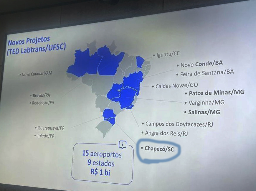 Acrescenta, ainda, que como sinalização política e técnica, o aeroporto de Chapecó foi citado como estratégico e como espaços que vem sendo batalhado, pelo poder público e as entidades empresariais, para entrar na carteira de projetos/investimentos, de forma a resolver problemas crônicos que afetam o transporte aéreo.