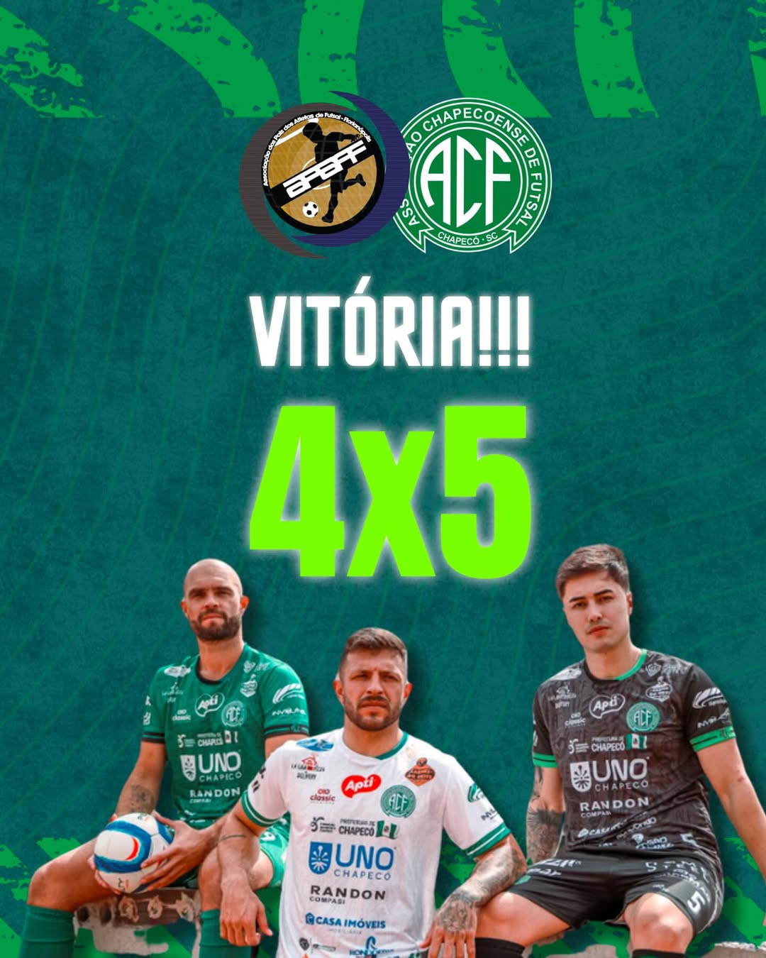 A equipe Prefeitura de Chapecó/Chapecoense/Unochapecó conquistou a primeira vitória no Estadual Série Ouro, da Federação Catarinense de Futsal. Em jogo eletrizante, o Verdão das Quadras derrotou a Apaff/Florianópolis por 5 a 4 na noite deste sábado (26/4), no ginásio do SESI, em São José. A partida completou a terceira rodada do campeonato.