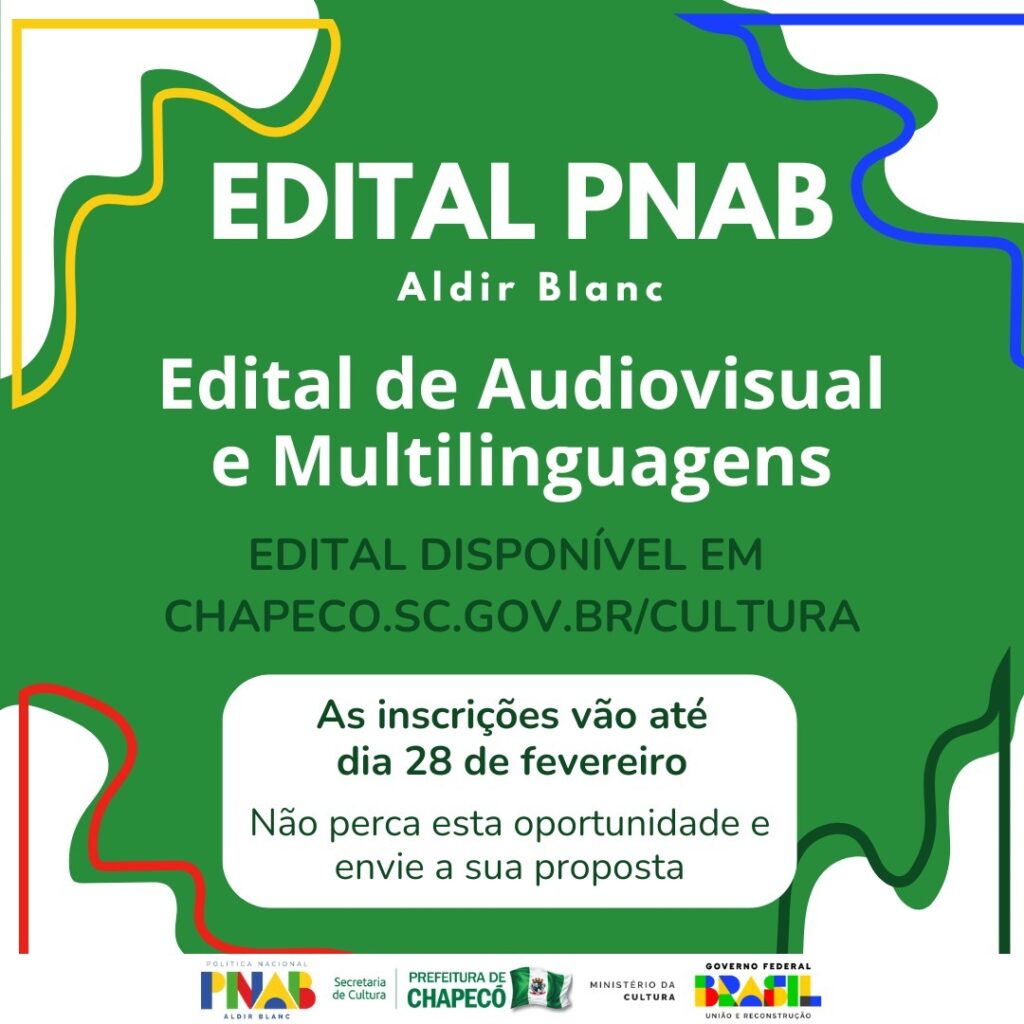 O Município de Chapecó, através da Secretaria de Cultura, está com edital aberto para inscrições na Política Nacional Aldir Blanc (PNAB), em duas modalidades: multilinguagens e audiovisuais. Os interessados devem se inscrever até o dia 28 de fevereiro e os formulários estão disponíveis no site da Secretaria de Cultura.