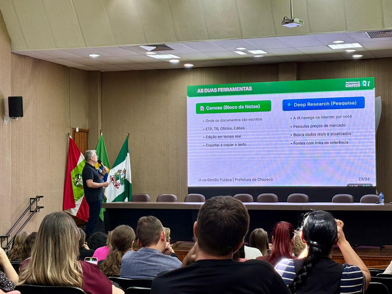 A Prefeitura de Chapecó promoveu na quinta-feira (12) uma oficina sobre o uso de inteligência artificial na gestão pública. A capacitação foi organizada pela Diretoria de Inovação e Modernização e reuniu cerca de 100 participantes no auditório da prefeitura, entre servidores municipais, representantes da Associação dos Municípios do Oeste de Santa Catarina e integrantes do Corpo de Bombeiros Militar de Santa Catarina.