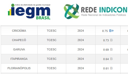 A Prefeitura de Chapecó alcançou o segundo melhor índice ambiental entre os 295 municípios de Santa Catarina, conforme o Índice de Efetividade da Gestão Municipal (IEGM), divulgado pelo Tribunal de Contas do Estado de Santa Catarina e pelo Instituto Rui Barbosa com base em dados de 2024. Entre as cidades catarinenses, Chapecó ficou atrás apenas de Criciúma.
