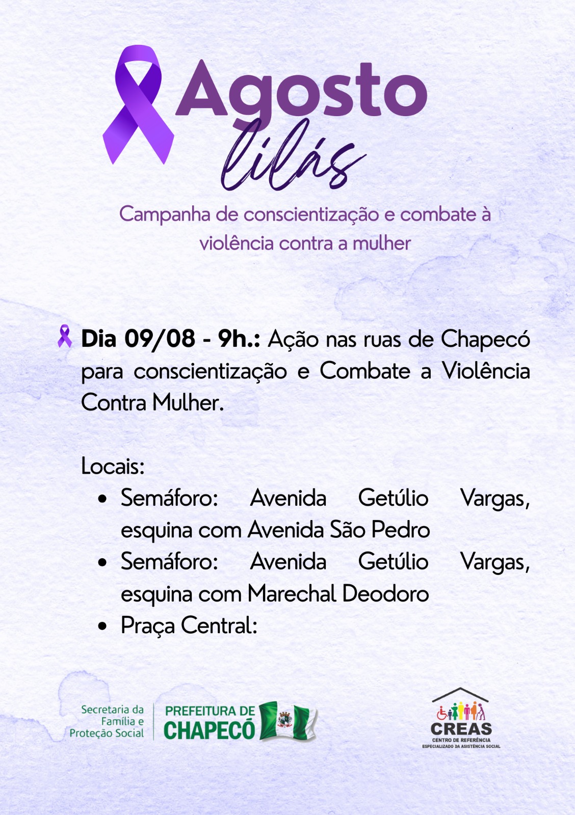 A Prefeitura de Chapecó, por intermédio da Secretaria da Família e Proteção Social, realiza ações que visam conscientizar a população sobre a violência contra a mulher. A campanha Agosto Lilás promoverá a divulgação da Lei Maria da Penha e fortalecer a rede de apoio às vítimas.