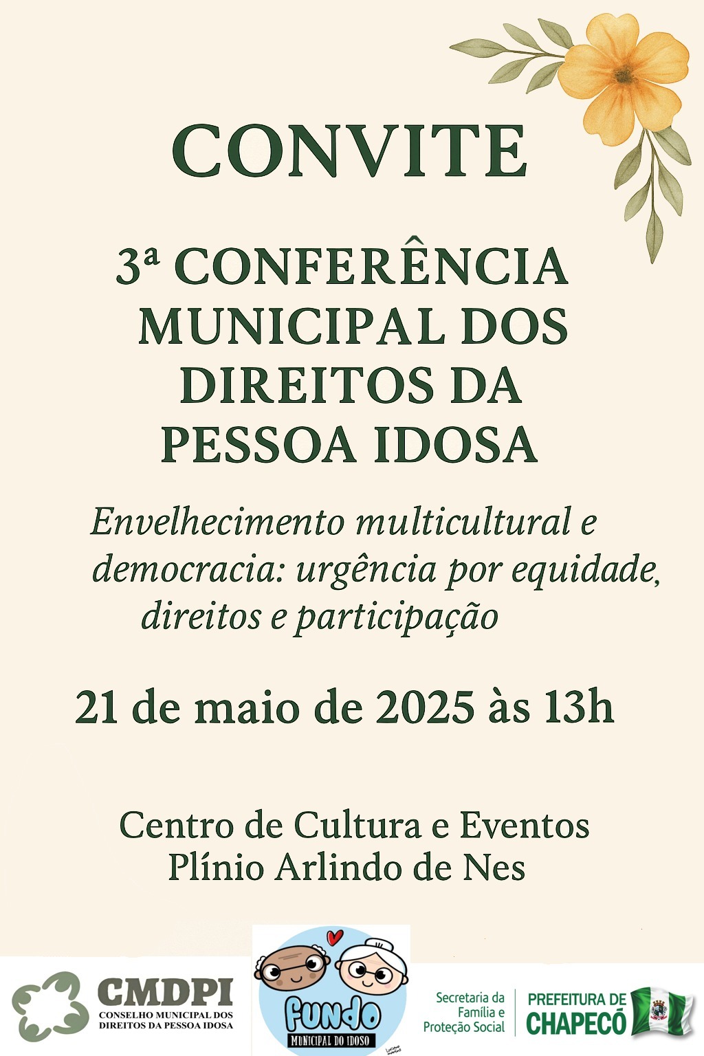A conferência é organizada pelo Conselho Municipal dos Direitos da Pessoa Idosa (CMDPI), com o apoio da Prefeitura de Chapecó, por meio da Secretaria da Família e Proteção Social, e conta ainda com o envolvimento do Fundo Municipal do Idoso.