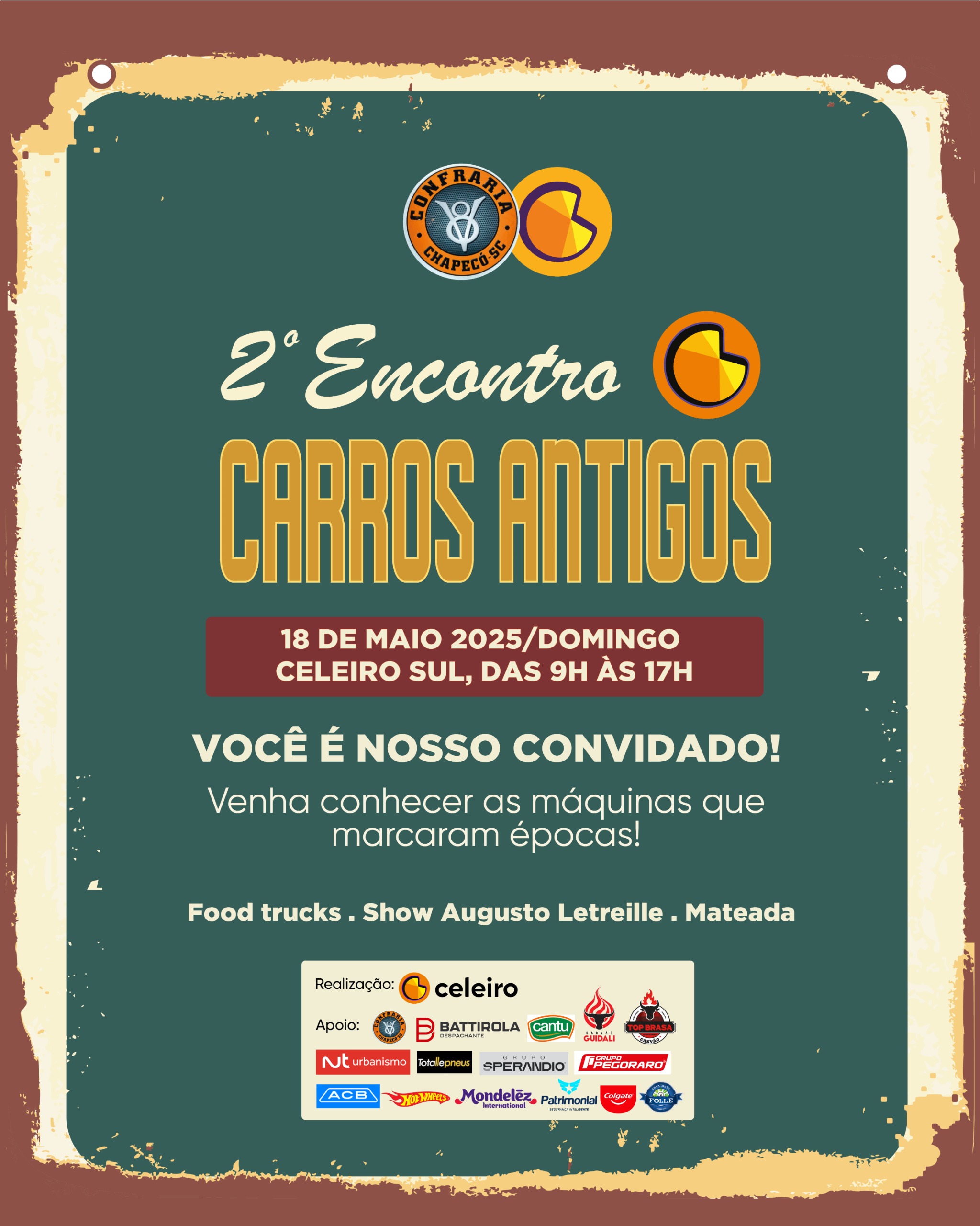 Aberto ao público, o encontro convida visitantes de todas as idades a apreciarem raridades sobre quatro rodas, em um ambiente que também contará com atrações culturais, como o show do cantor Augusto Letreille, além de mateada e praça de alimentação com food trucks variados.