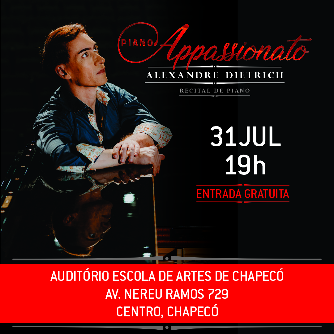 Chapecó será palco de uma noite dedicada à música erudita com o recital “Piano Appassionato”, apresentado pelo renomado pianista Alexandre Dietrich, nesta quinta-feira, 31 de julho, às 19h, na Escola de Artes de Chapecó. A entrada é gratuita e aberta ao público, respeitando a capacidade do local.