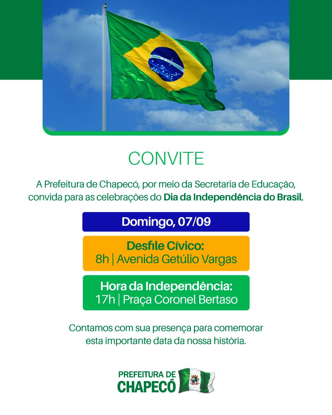 A Prefeitura de Chapecó, por meio da Secretaria de Educação, realizará neste domingo, 7 de setembro, as comemorações alusivas ao Dia da Independência do Brasil. A programação inclui atividades que destacam o civismo e a importância desta data histórica para o país.