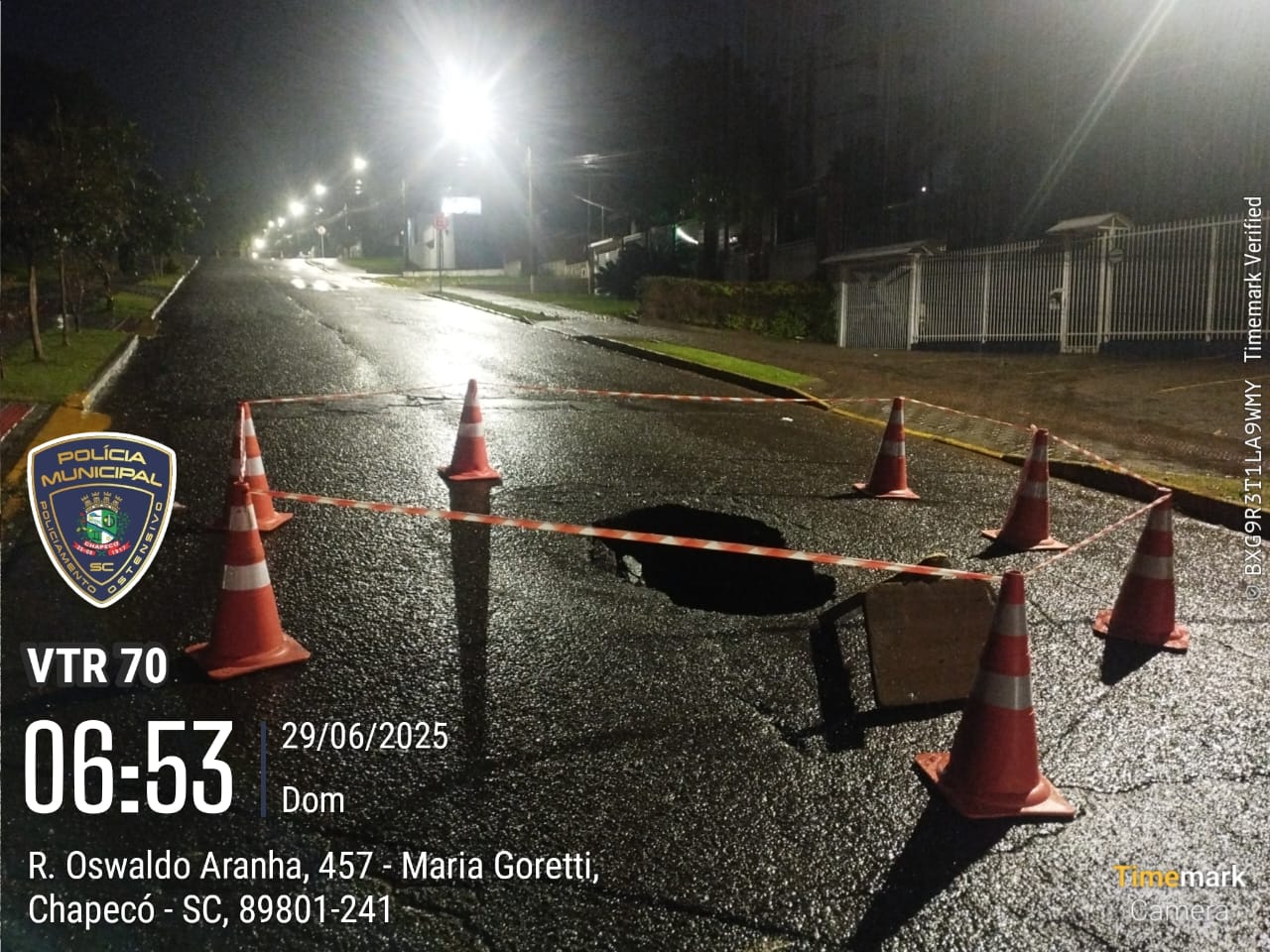 A Secretaria de Segurança Pública de Chapecó informa que, devido às chuvas das últimas horas, um buraco se abriu na rua Oswaldo Aranha, no Bairro Maria Goretti.