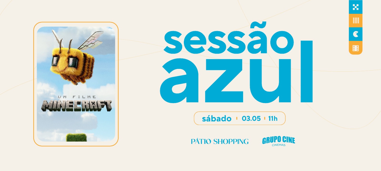 Sessão Azul, com a exibição do longa “Um Filme Minecraft”. A iniciativa oferece uma experiência adaptada para pessoas com Transtorno do Espectro Autista (TEA) ou síndrome de Down. Os ingressos custam R$ 10,00 e podem ser adquiridos antecipadamente pelo site shoppingpatiochapeco.com.br ou na bilheteria do Grupo Cine.