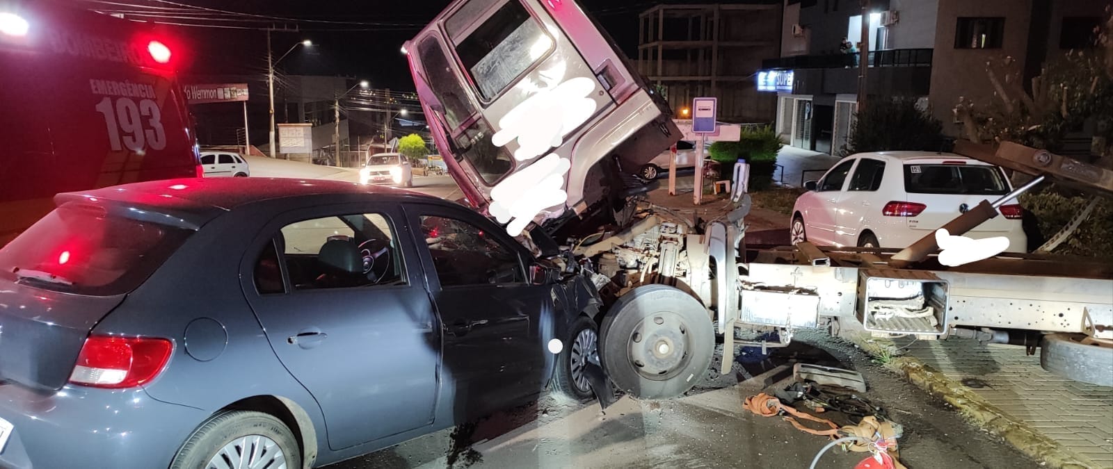 Na noite deste domingo, 4 de maio de 2025, por volta das 23h39min, o Corpo de Bombeiros Militar de Chapecó foi acionado para atender a um acidente de trânsito na rua Afonso Pena, no bairro Bela Vista. A colisão envolveu um caminhão e um veículo de passeio VW/Gol.