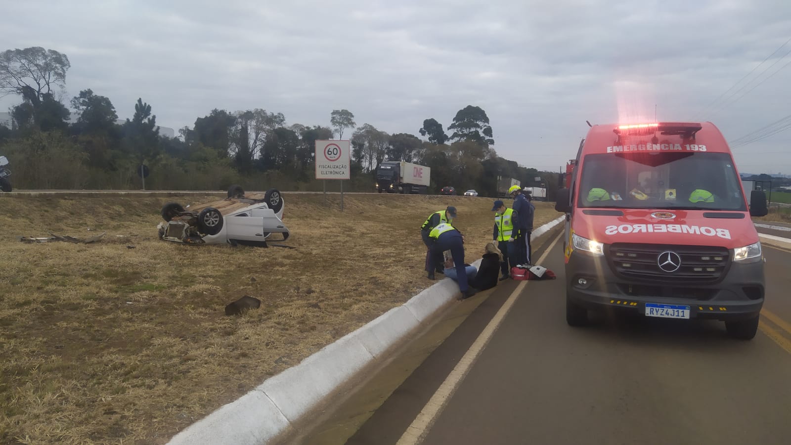 De acordo com os bombeiros, após o impacto, o veículo de passeio saiu da pista e capotou. As ocupantes do carro, duas mulheres de 22 e 40 anos, foram encontradas fora do veículo, sentadas à beira da rodovia. Uma delas apresentava sonolência e relatava dores na região lombar; a outra sofreu escoriações no couro cabeludo e também se queixava de dores.