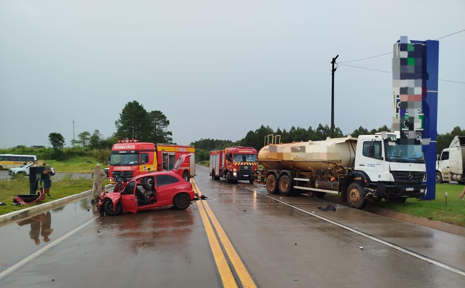 De acordo com o Corpo de Bombeiros Militar, o automóvel GM/Celta colidiu lateralmente contra um caminhão e, na sequência, bateu de frente com um segundo veículo de carga. No carro estavam duas vítimas.
